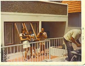 A Zena, a filhinha e eu, segurando o casalsinho de cães que a rainha Elizabeth mandou de presente. Claro que não aceitei, fiz questão de pagar.